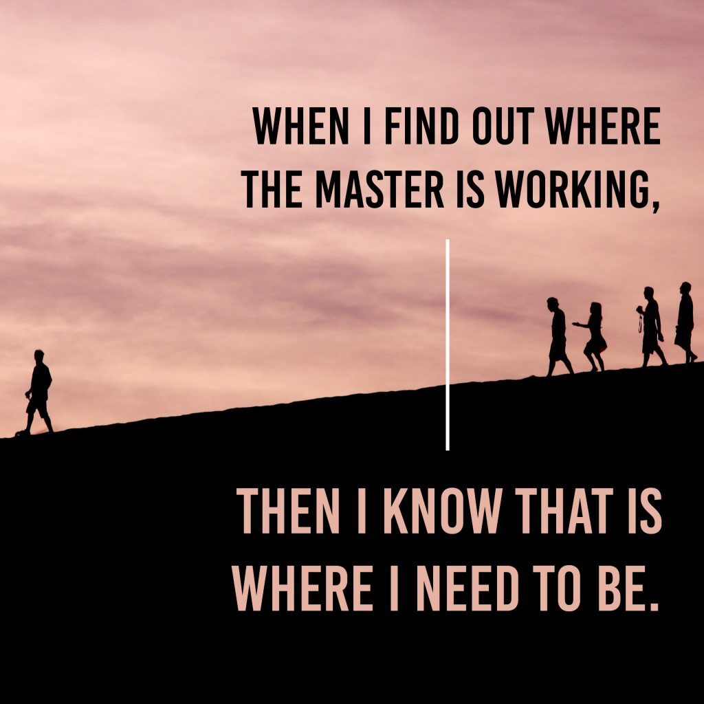 From Ciara – A servant of a human master works FOR his master. But God works THROUGH His servants. He accomplishes His works through His servants. God wants us to know that to know God you need to obey Him and learn by experience. Dear Lord, would you please help me to obey you more and learn by experiences and so you can accomplish your work through me. And when we find out where you are and what you are doing we know that is where we need to be, with you. -Amen